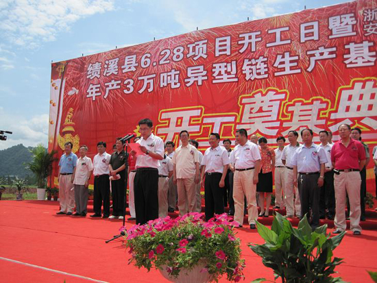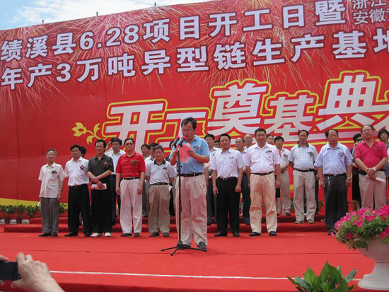 10时8分许,宣城市委副书记、市长虞爱华,中国机械通用零部件工业协会理事长刘元杰、副秘书长姚海光,宣城市工行行长李为民,绩溪县委书记张平、县长李前智等县领导,国家链传动协会秘书长王民梁,绩溪企业家协会会长姚民和,美国客户代表等嘉宾,在欢快的乐曲声中,神采奕奕地走上庆典礼台。仪式由绩溪县长李前智主持。