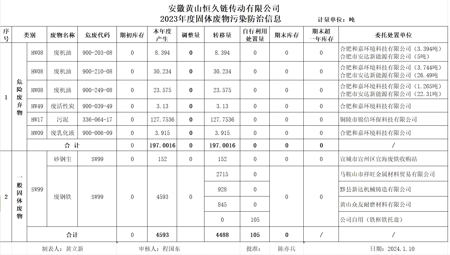 安徽黄山ballbet贝博链传动有限公司 2023年度固体废物污染防治信息