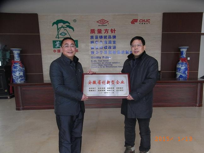 我公司致力于自主技术创新,年年有亮点,年年结硕果。2014年底被安徽省科技厅等八个部门联合评定为“安徽省创新型企业”。绩溪县科技局长程宗华一行受省市科技主管部门的委托,亲自进厂授牌,还解读了相关优惠政策,并勉励我公司再接再厉,让科技之花常开常艳。