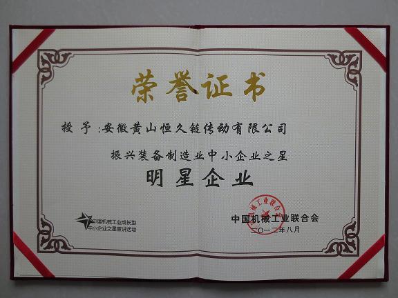 2012年8月8日,在中国机械联合会主办的中国机械工业成长型中小企业之星宣讲报告会上,我公司喜获中机联表彰,被授予“振兴装备制造业中小企业之星明星企业”称号。同时,公司总经理陈亦兵被授予“振兴装备制造业中小企业之星明星企业家”称号。