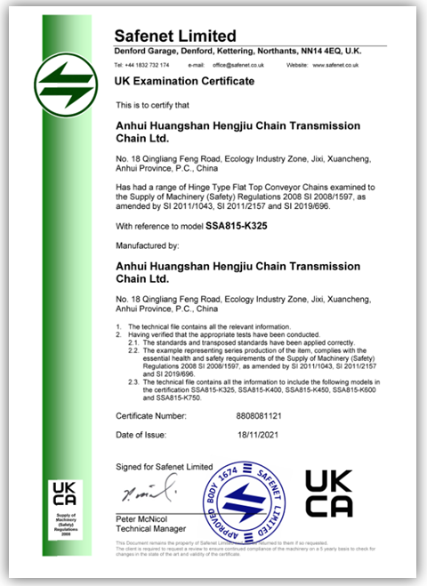 黄山ballbet贝博公司SSA815系列输送用平顶链产品 顺利通过CE&UKCA认证