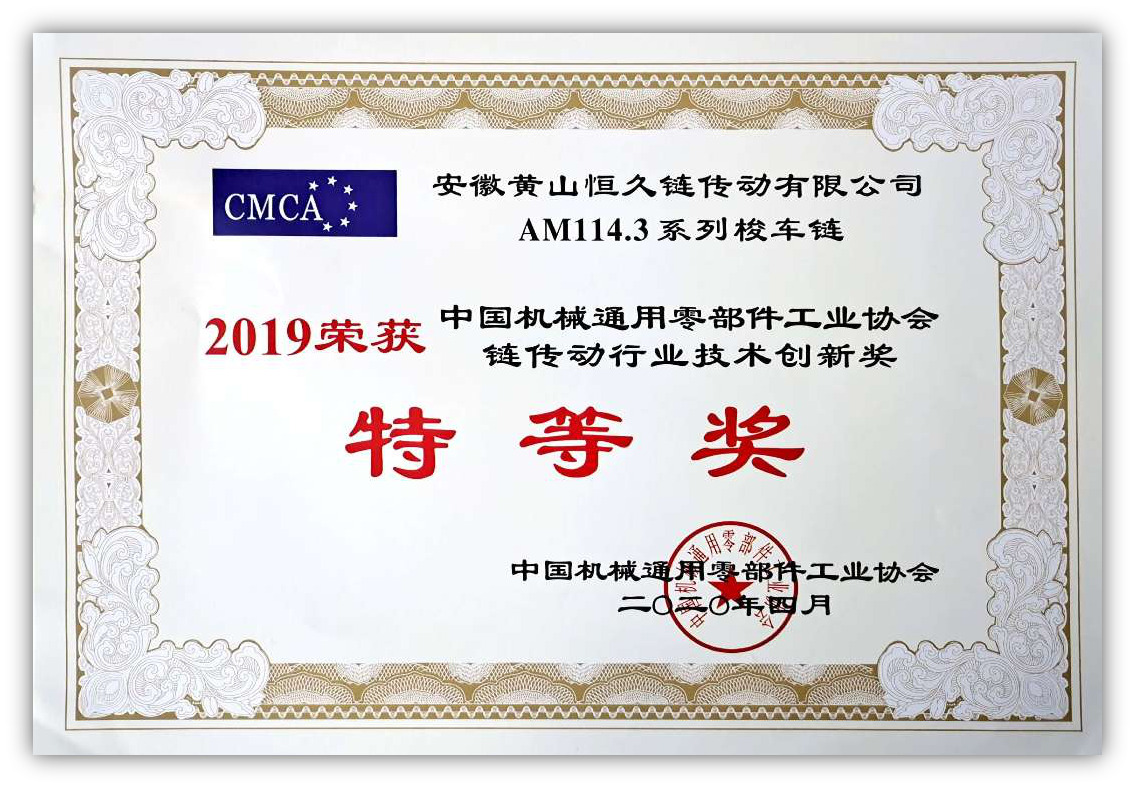 日前,在中国机械通用零部件工业协会七届三次理事会暨会员代表大会上,黄山ballbet贝博公司自主研发的“黄山牌”AM114.3系列梭车链荣获“2019年度行业技术创新特等奖”。该系列产品左右双排并列使用,中间通过链条附件联结大型刮板,链条运行时通过刮板带动输送物料,应用于矿山物料输送等设备。