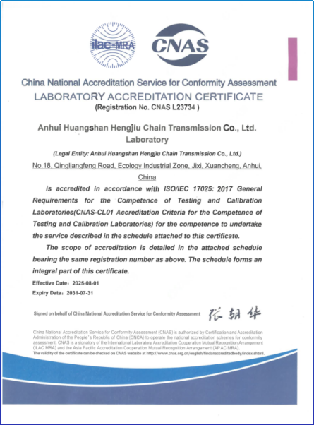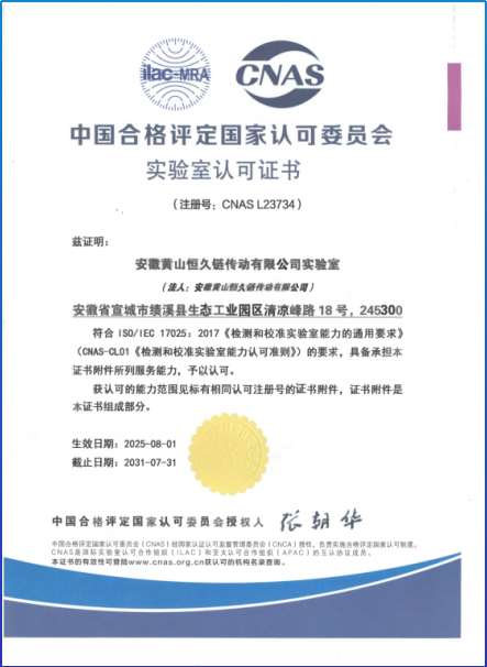 近日,安徽黄山ballbet贝博链传动有限公司实验室获得由中国合格评定国家认可委员会(CNAS)颁发的ISO/IEC17025认可证书(注册号:CNAS L23734),认可的检测能力范围包括8个类别25个检测项目。这一里程碑式突破,标志着我司实验室在质量管理体系、技术能力和服务水平等方面已达到ISO/IEC17025认可标准,具备依据ISO/IEC 17025体系要求开展检测工作的技术能力。